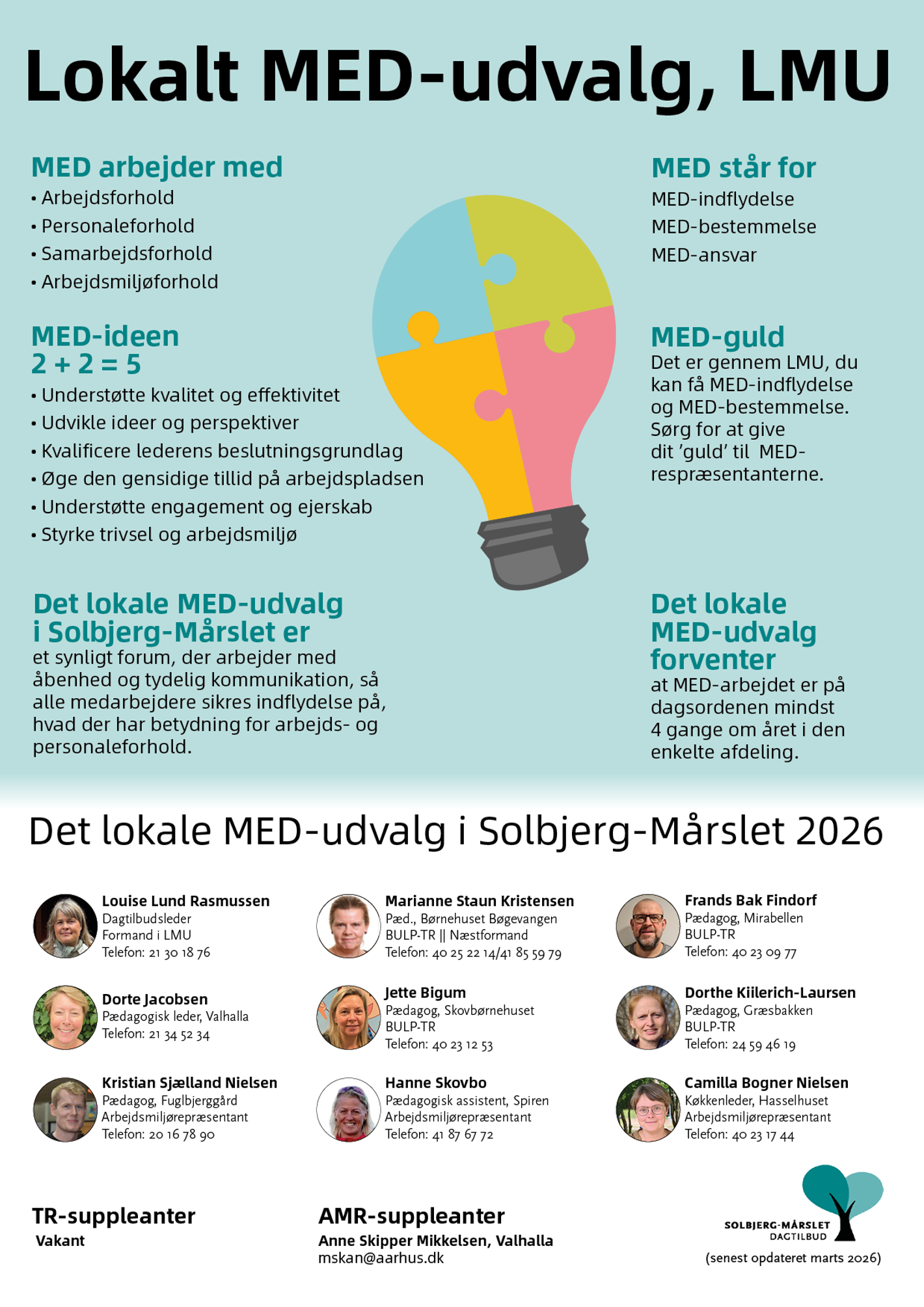 I vores dagtilbud styrker ledere og medarbejdere også samarbejdet om kerneopgaven gennem vores lokale MED-udvalg, LMU. Arbejdet i LMU giver medarbejderne mulighed for at få medindflydelse og medbestemmelse på forhold, der har betydning for arbejds- og personaleforhold.