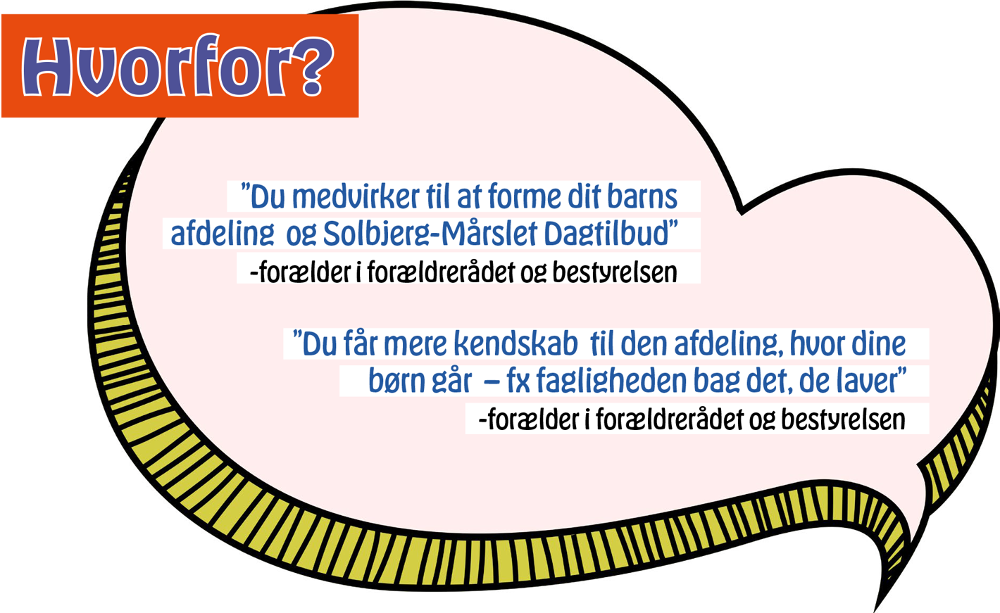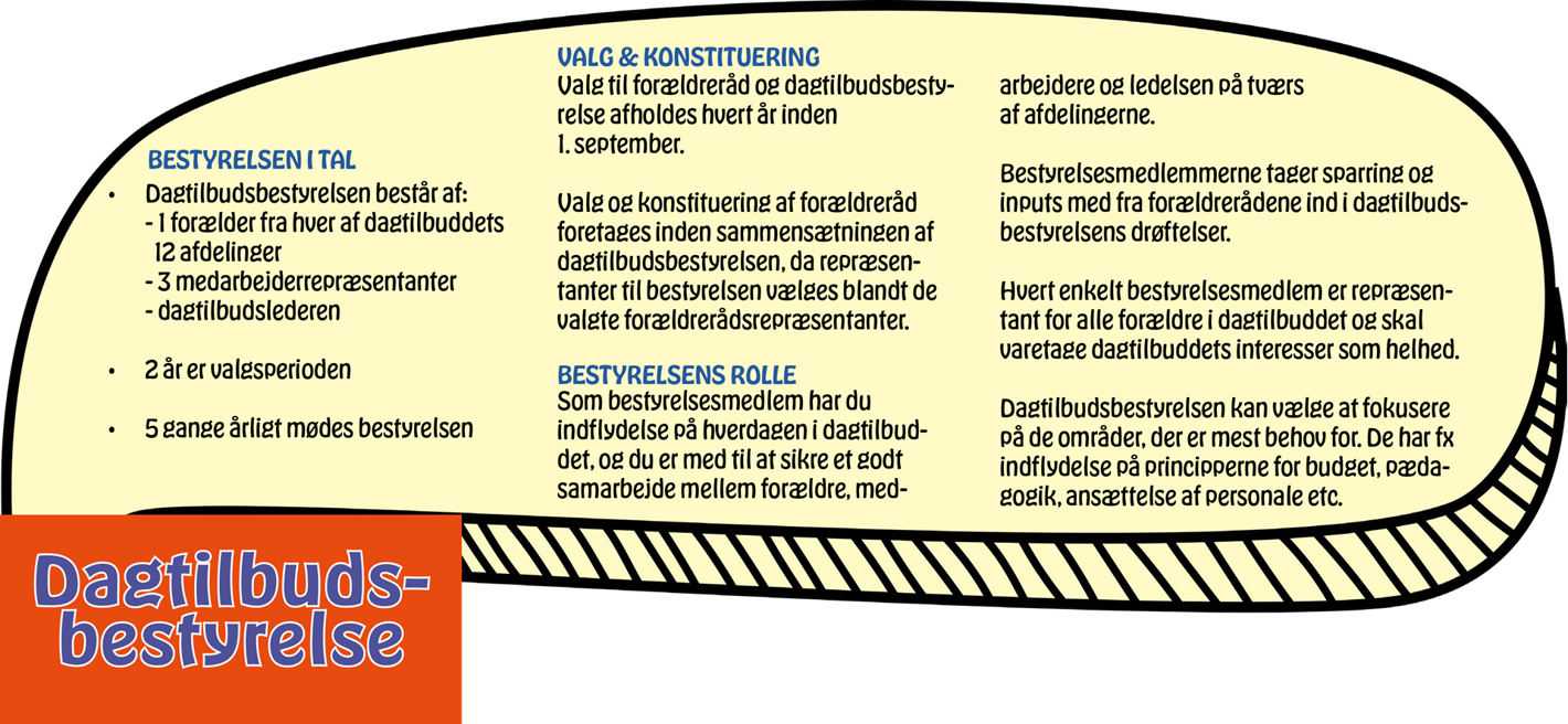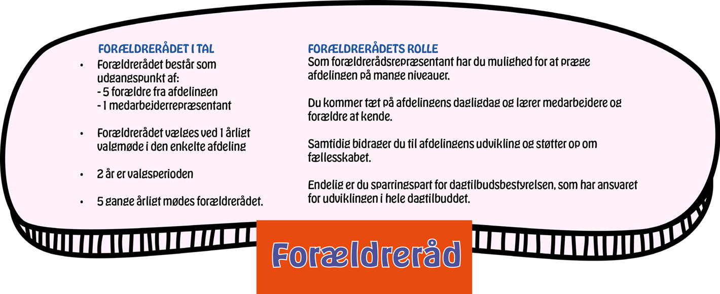 Som medlem af forældrerådet har du desuden mulighed for at blive afdelingens repræsentant i dagtilbuddets bestyrelse.