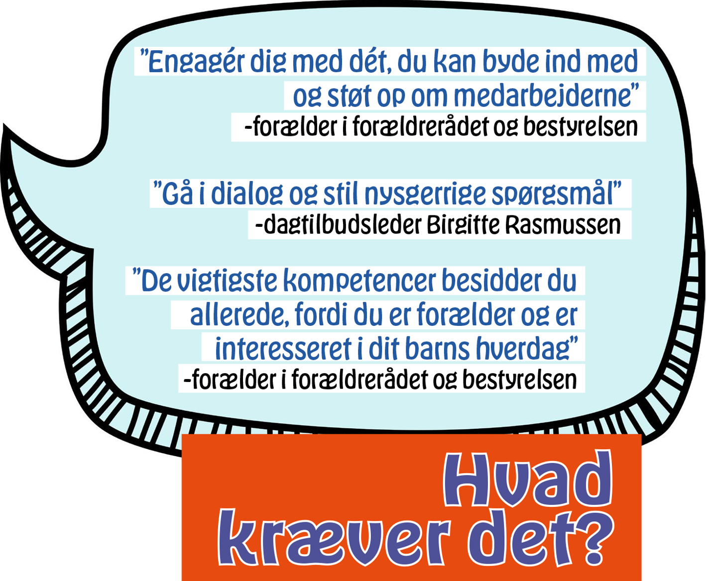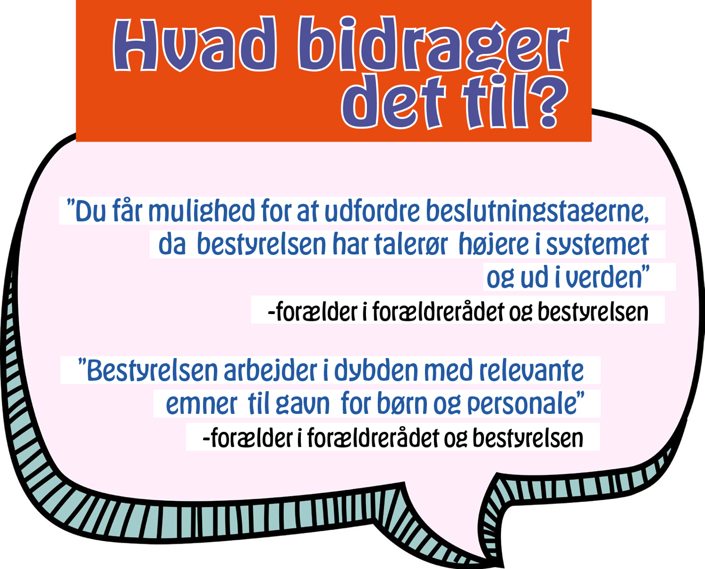 Du får indflydelse på hverdagen i dagtilbuddet, og du er med til at præge de beslutninger, som dagtilbudslederen træffer på dagtilbuddets vegne. I bestyrelsen har du mulighed for at bringe dine synsvinkler i spil, når I for eksempel skal udarbejde principper for dagtilbuddet.