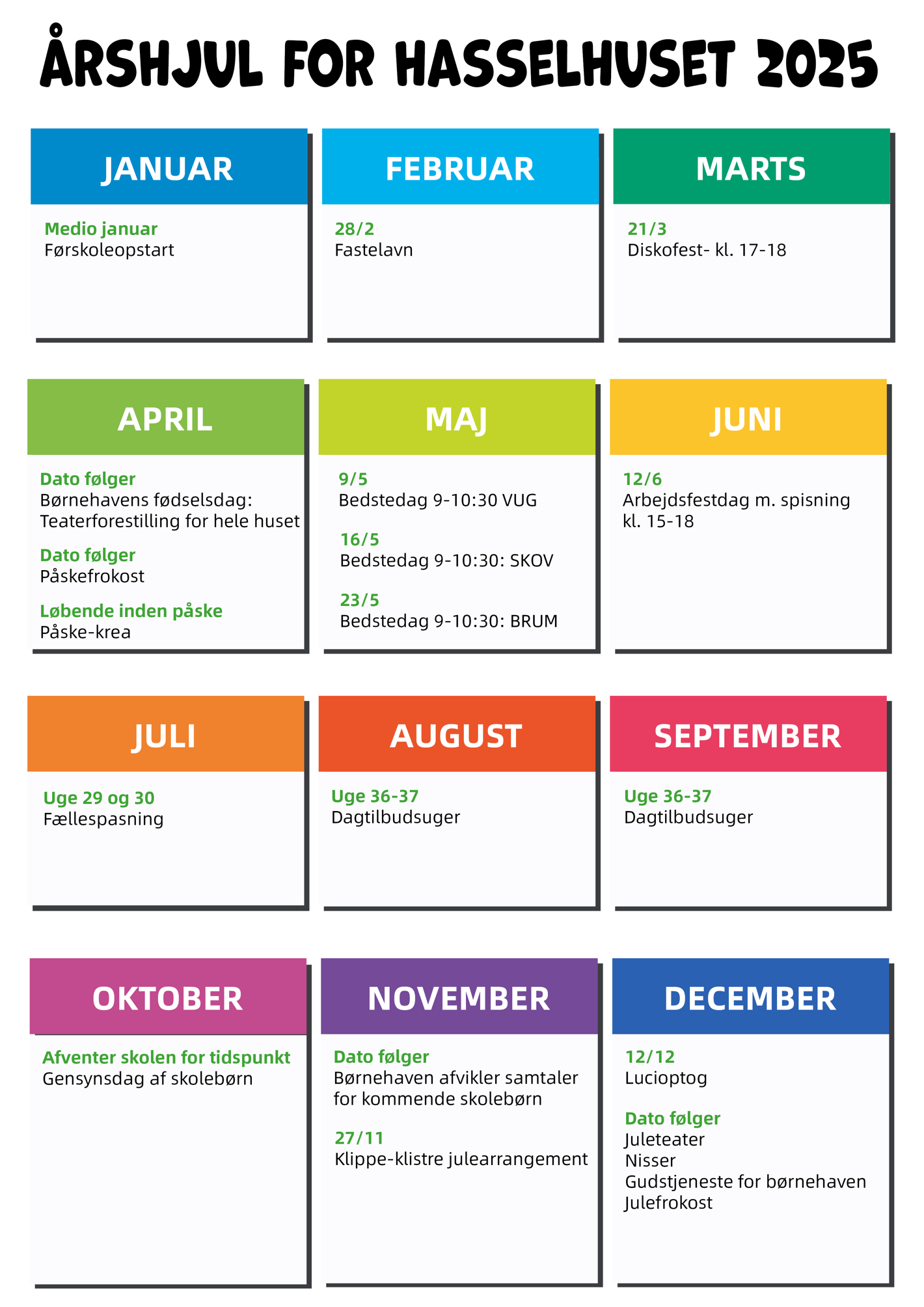 I Hasselhuset ligger vores hovedfokus på kerneopgaven. Vi arbejder for, at alle børn har en tryg hverdag, og at der er plads til alle børns personlighed. Dette ser vi som fundamentet for, at alle børn kan trives og udvikle sig.